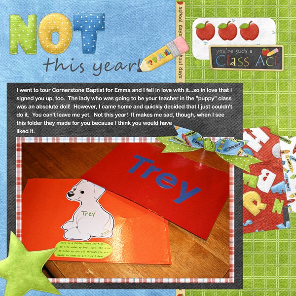 Journaling reads: “I went to tour Cornerstone Baptist for Emma and I fell in love with it…so in love that I signed you up, too. The lady who was going to be your teacher in the “puppy” class was an absolute doll! However, I came home and quickly decided that I just couldn’t do it. You can’t leave me yet. Not this year! It makes me sad, though, when I see this folder they made for you.”