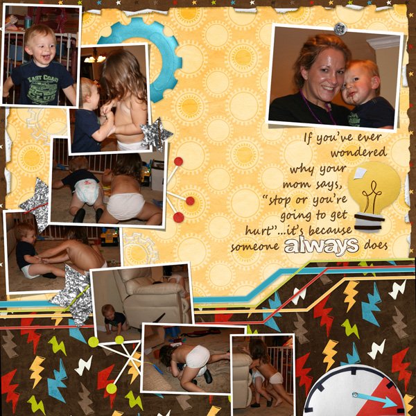 Emma & Trey roughhousing….actually Trey finally got something away from Emma (she normally snatches from him)….he proceeded to taunt her with it and she is wrestling him for it until it finally ends with Trey getting pushed against our metal baby gate….then, Emma grabbed the camera and took the picture of Trey crying!