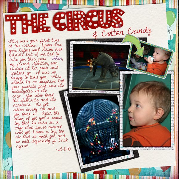 Journaling reads: This was your first time at the Circus. Emma has gone before with Gram and ChiChi but I wanted to take you this year. Then, my friend, Heather, won tickets at her work and couldn’t go. I was so happy to take you. This should be no surprise but your favorite part was the motorcycles in the cage. You also loved the elephants and the acrobats. We got cotton candy, too and you loved it! After the show, I got you a wand toy that is cars in a cage that spins around and got Emma a toy, too. We had so much fun and we will definitely go back again! ~2-11-10